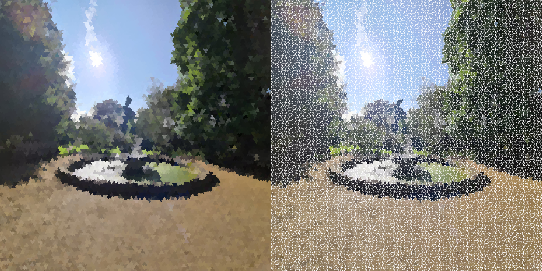 Firstly, it generates a large enough H-Supertile, from smaller supertiles and metatiles as described in the arXiv paper, until the patch of hat tiles covers the entire image (depending on the resolution chosen in the program settings). Then the hats are overlaid on top of the image, and the modal pixel colour of the image pixels within each individual hat is calculated, and finally the colour of all pixels within a hat is set to be the modal pixel colour for said hat, such that the new image constructed consists only of solid-coloured hat tiles. Optionally, it can also produce a version with borders around the hat tiles (as seen in the second half of the second image) so it is easier to identify the individual hat tiles. The size and resolution of the output image can also be configured.